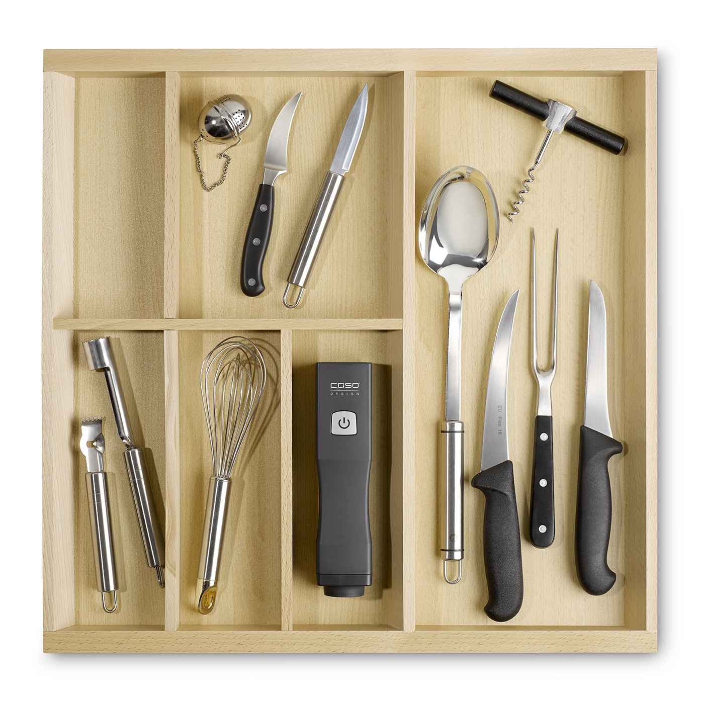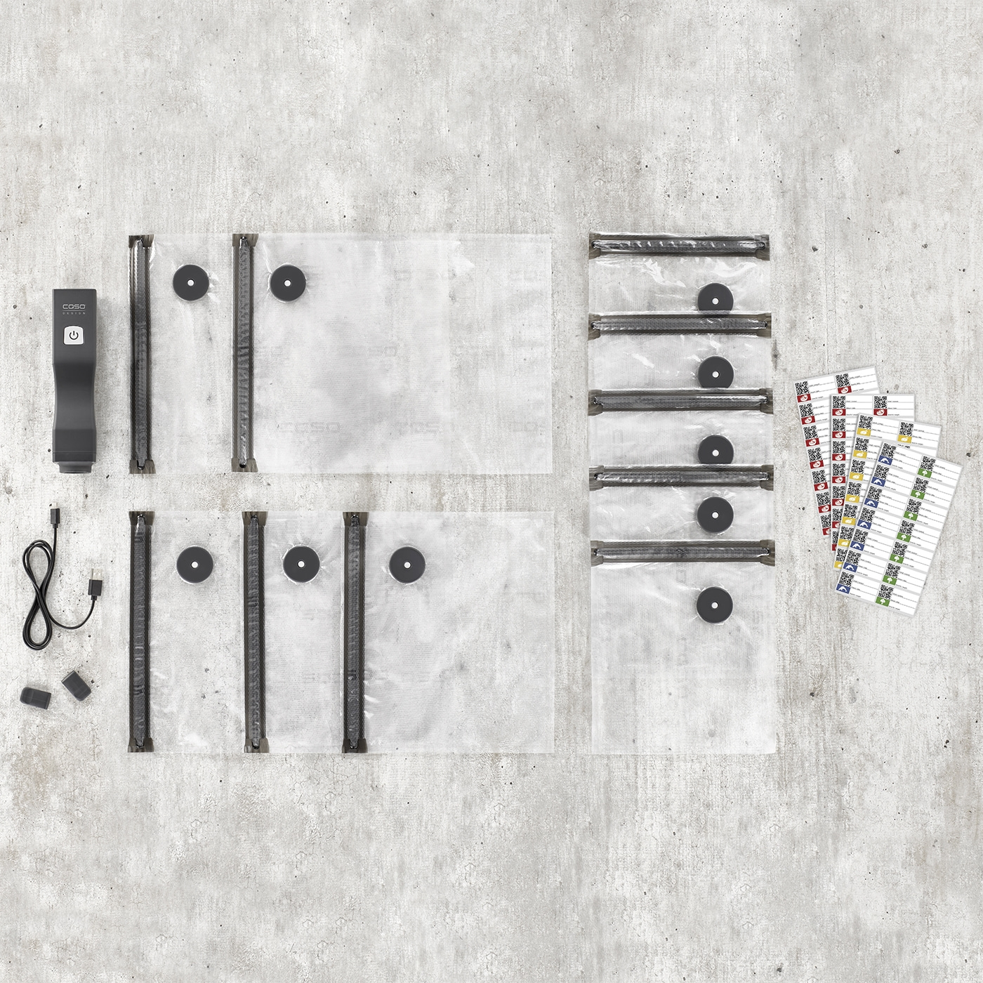 – Incluye 10 bolsas ZIP (5 de 20×23 cm, 3 de 26×23 cm, 2 de 26×35 cm), 2 ZIP-Lock, cable de carga USB-C y pegatina del CASO Food Manager.