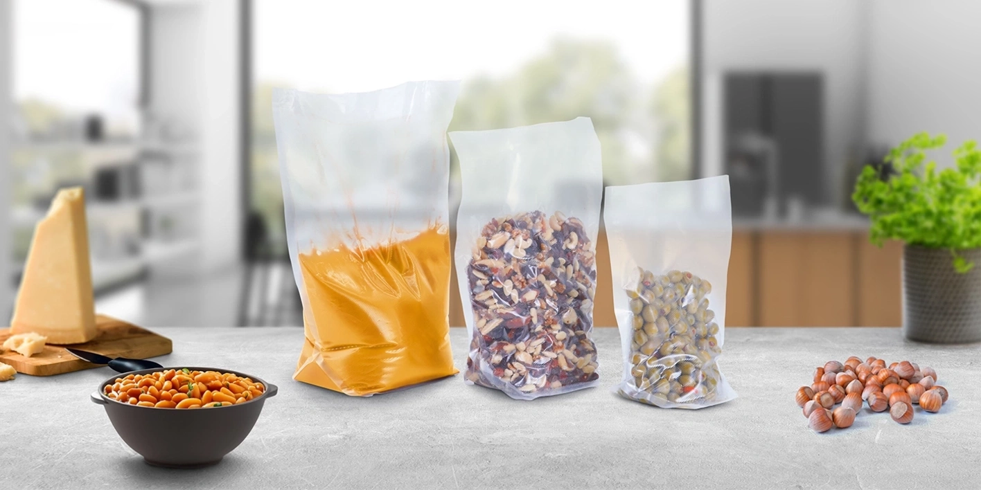 - Bolsas de vacío innovadoras con base plana: ideal para envasar al vacío líquidos y alimentos voluminosos