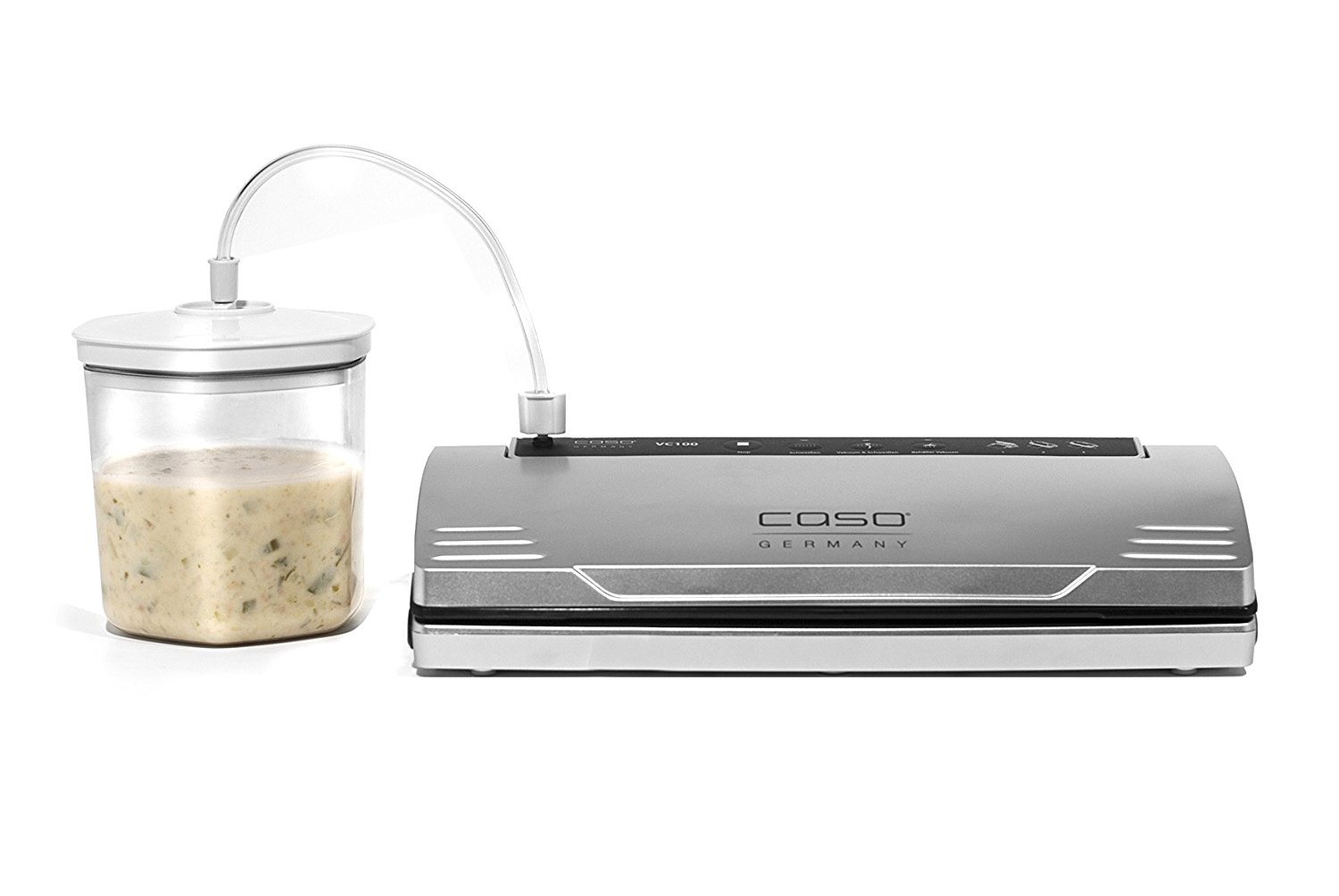 | – 3 recipientes para envasar alimentos líquidos y sensibles a la presión – Se pueden reutilizar frecuentemente. – Recipiente hecho de acrilonitrilo de estireno robusto. – Tapa de plástico SAN. – Resistente a roturas y apto para lavavajillas. – Compatible con todos los envasadoras al vacío CASO con función de contenedor. – Apilable y ahorra espacio (14 cm de ancho). – Incluye manguera de vacío.- 0,70 litros: 10 cm de alto. – 1,40 litros: 15,5 cm de alto. – 2,00 litros: 21 cm de alto. |